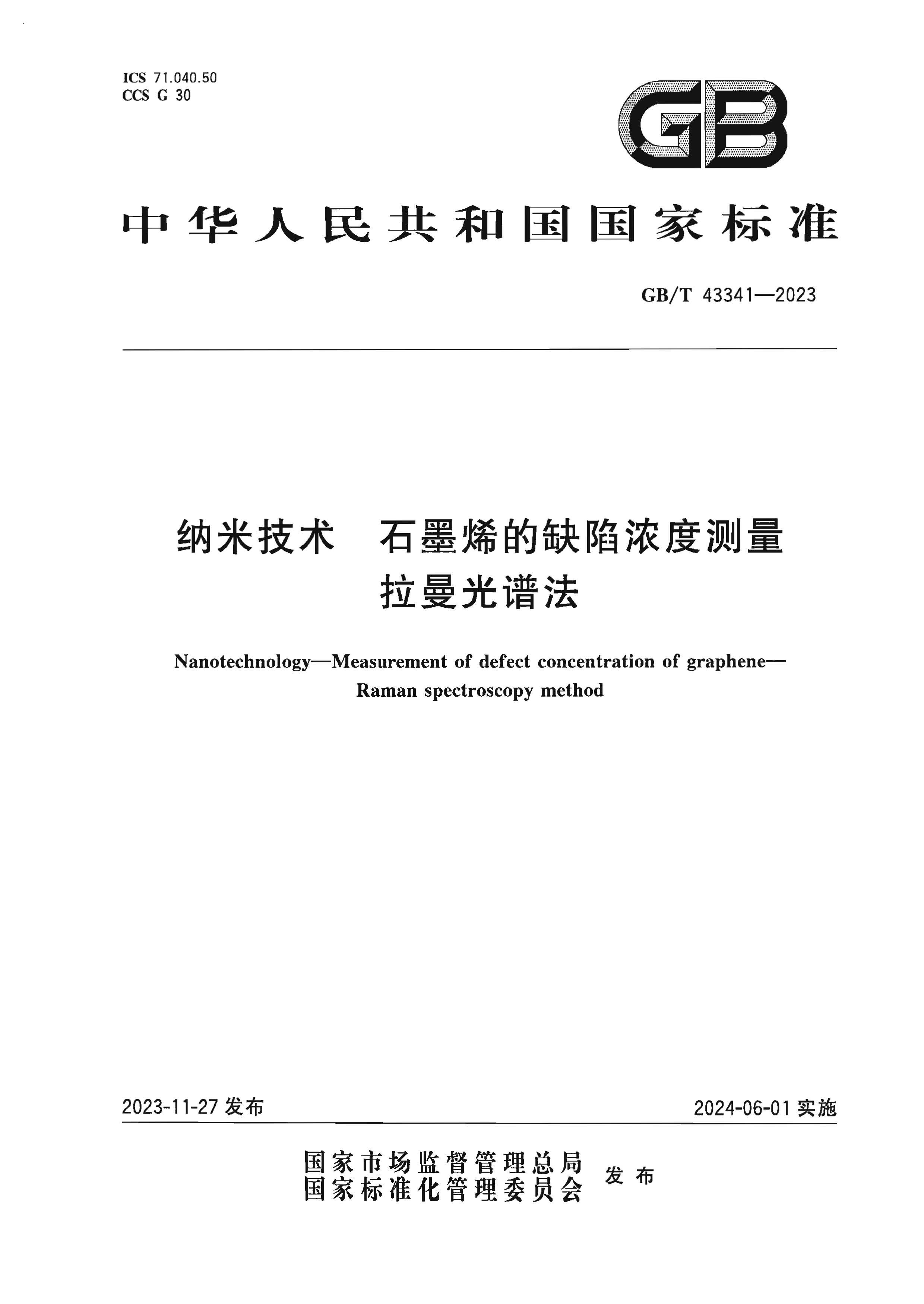 2023年11月27日,國家市場(chǎng)監督管理總局(國家標準化管理委員會(huì ))發(fā)布2023年第13號中華人民共和國國家標準公告,批準由泰州石墨烯研究檢測平臺有限公司和東南大學(xué)牽頭起草的國家標準GB/T 43341-2023《納米技術(shù) 石墨烯的缺陷濃度測量 拉曼光譜法》正式發(fā)布,并將于2024年6月1日起實(shí)施。